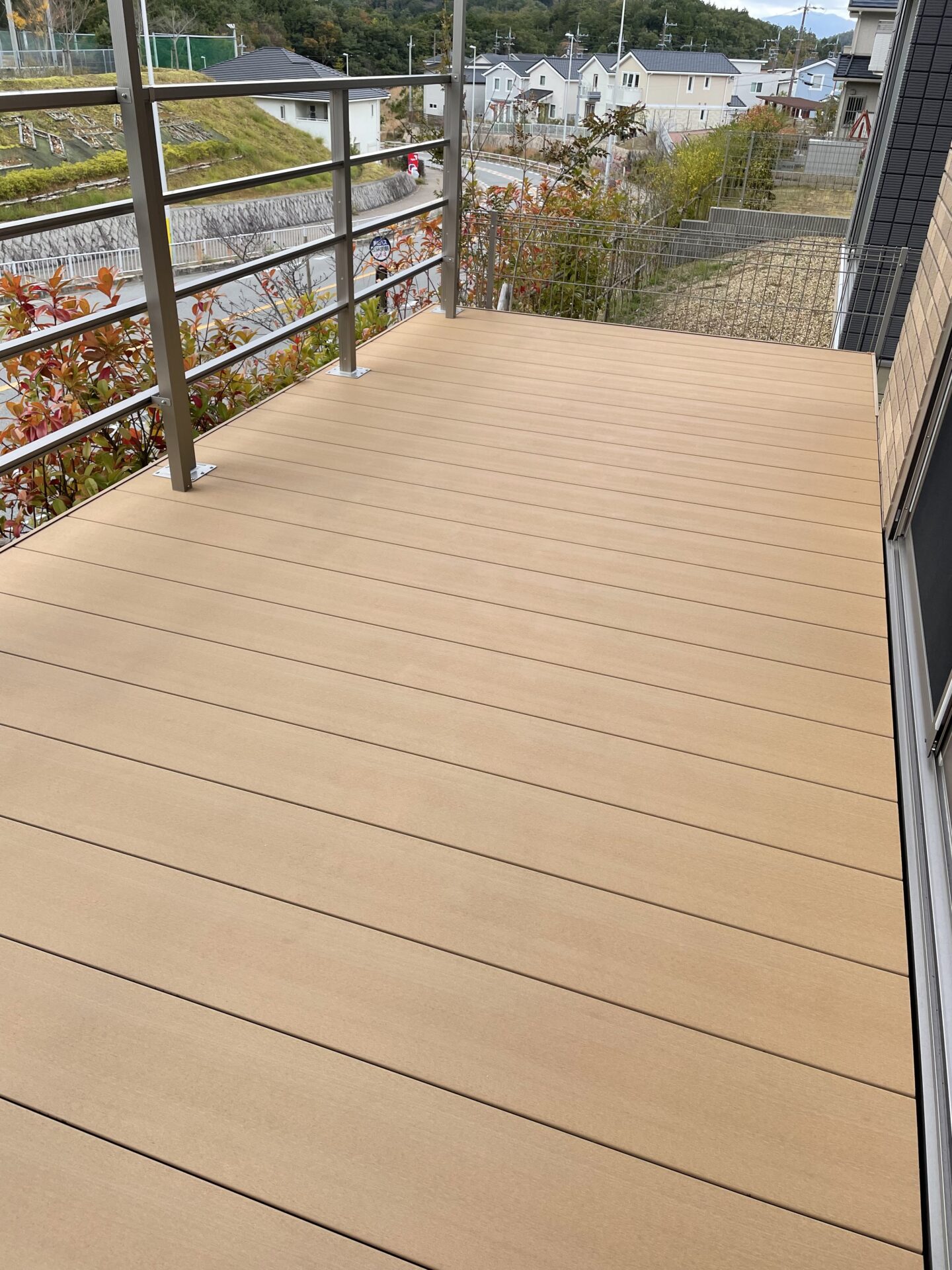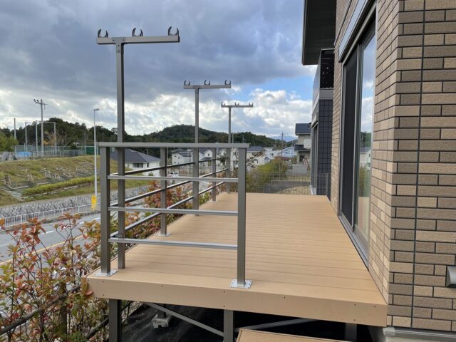 物干し場所等のの為ウッドデッキを取付しました。自然木と違い、人工木材にしたため腐食やメンテナンスの心配がなく耐久性も高いウッドデッキとなりおすすめです。