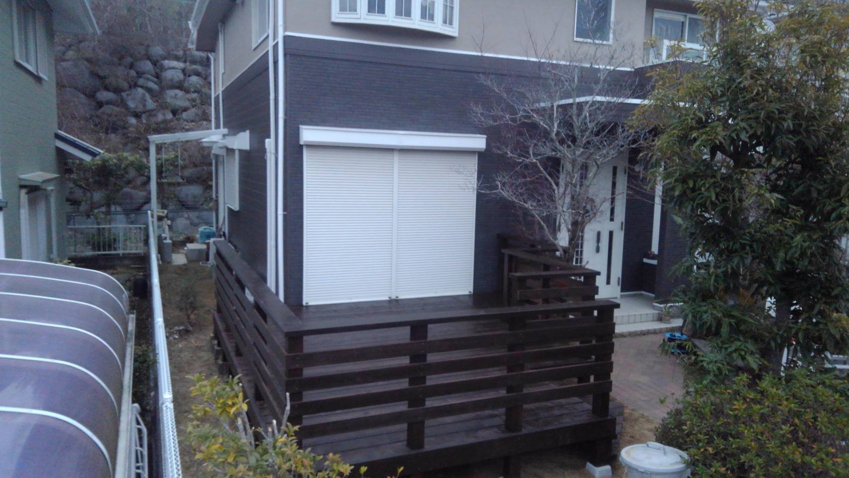外壁は、正面をタイル調のサイディングに張り替えその他は塗装し、ウッドデッキも新しく造作し、1ヶ月程の大型リフォームをさせていただきました。